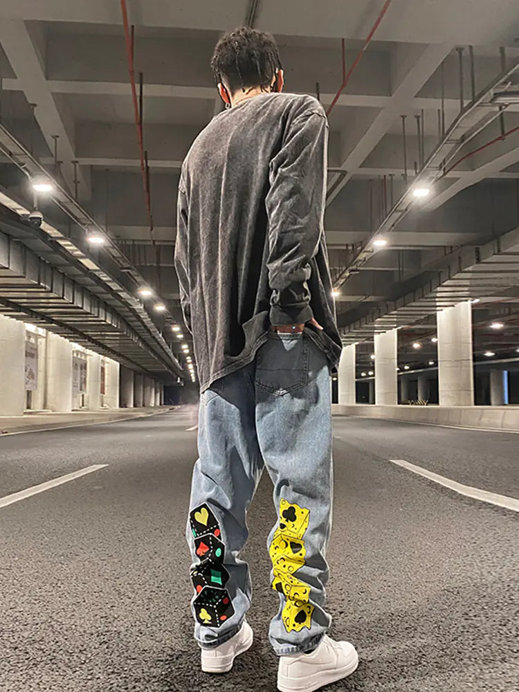 Loose Wide-Leg Jeans with Dice Cheese Print